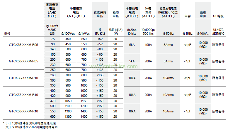 表 G1 两电极GDT器件额定电压值、额定浪涌值、电容值、绝缘电阻值和安规认证