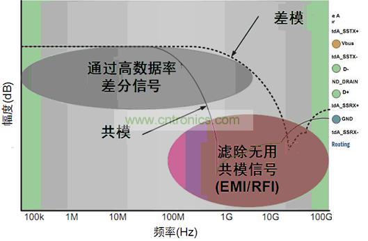 这些应用中能使用共模滤波器(CMF)来消除不想要的共模噪声,并防止高速信号辐射有害的共模噪声信号至系统其它元件。同时,CMF还使想要的高速数据事实上不受影响地通过。典型的CMF特性如图4所示,图中显示消除了共模噪声,同时支持差模信号无损通过。