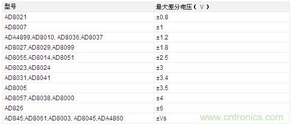 为了解决这一问题,首先尽量选择具有较高差分电压额定值的放大器。遗憾的是,放大器的选择可能还会考虑其他诸多参数(但差分输入?;げ皇瞧渲械牟问?。放大器数据表中绝对最大额定值的选择通常表明其最大差分输入电压。如果性能指标小于±Vs,则提供某些内置输入?;?。电压越低,电路表现出截止状态隔离度的可能就越大。表1给出所选放大器的差分电压额定值。