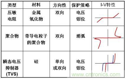 安森美半导体来自美国的ESD保护专家Robert Ashton博士说,一般而言,ESD?;ぴ姆掷嗫梢酝ü浔;げ呗杂敕较蛐岳唇校饕ㄑ姑舻缱?、聚合物和瞬态电压抑 制器(TVS)等,如表1所示。在这几种保护元件中,压敏电阻在低电压时,呈现出高电阻,其中的每个小型二极管两端的电压都相当低,同时电流也相当??;而在较高电压时,其中的独立二极管开始导通,同时压敏电阻的电阻会下降。从表1中我们也可以看出压敏电阻为双向?;ぴ?。而对于带导电粒子的聚合物而言,在正常电压下,这些材料拥有相当高的电阻,但当发生ESD冲击时,导电粒子间的小间隙会成为突波音隙阵列,从而带来低电阻路径。
