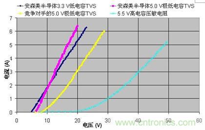 图3的屏幕截图就是这样一个范例。从图中可以看出,安森美半导体的TVS元件可以迅速将ESD应力降低,即从8 kV静电电压钳位到5至6 V的水平;但压敏电阻的曲线则下降得很慢,而且无法降到很低的水平。该曲线表明,TVS器件的恢复时间非常短,经过TVS器件泄漏到后面电路的能量也非常少,特别适合于便携式设备的应用。
