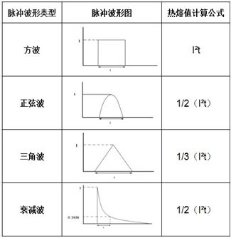 表2是几种常见脉冲波形的计算公式。脉冲电流的热熔值可以通过对脉冲电流波形数据的积分计算得到。
