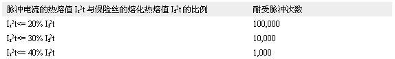 由于脉冲电流通过保险丝的时候,会产生热量,所以虽然单次脉冲的能量不足以使保险丝熔断,但多次脉冲冲击会导致保险丝熔断。为了保证保险丝可以耐受规定次数的脉冲电流,需要依据表3中所示的脉冲折减系数计算保险丝的I2t规格。如果脉冲发生时,保险丝所处环境温度高于室温(+25°C),须做相应的温度折减。