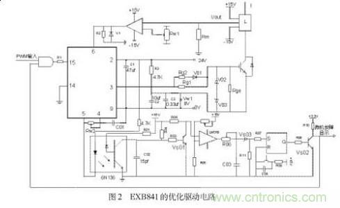 如图2所示,用外接8V稳压管Vw1代替驱动芯片内部的稳压管Vz2,在稳压管两端并联了两个电容值分别为105μf和0.33μf的去耦滤波电容。为防止栅极驱动电路出现高压尖峰,在栅射极间并联了反向串联的16V(V02)和8V(V03)稳压二极管。为了改善控制脉冲的前后沿陡度和防止震荡,减小IGBT 集电极的电压尖脉冲,需要在栅极串联电阻Rg。栅极串连电阻Rg要恰当,Rg过小,关断时间过短,关断时产生的集电极尖峰电压过高;Rg过大,器件的开关速度降低,开关损耗增大。优化电路采用了不对称的开启和关断方法。在IGBT开通时,EXB841的3脚提供+16V的电压,电阻Rg2经二极管Vd1和Rg1并联使Rg值较小。关断时,EXB841内部的V5导通,3脚电平为0,优化驱动电路在IGBT的E极提供-8V电压,使二极管V01截止,Rg= Rg1具有较大值。并在栅射极间并联大电阻,防止器件误导通。