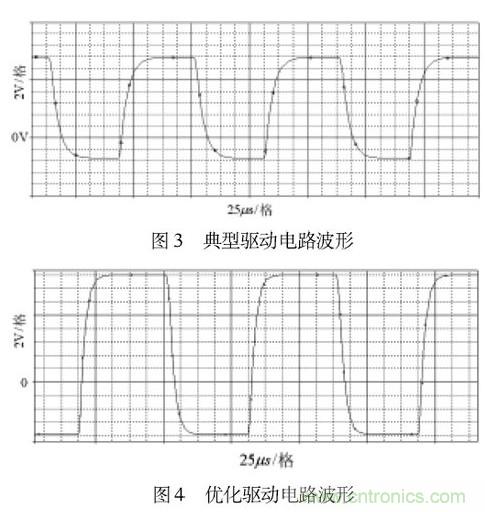 图3为实测典型驱动电路驱动波形,图4为实测优化驱动电路波形。通过两图的对比,不难看出,典型驱动电路的反向关断电压不到-5V,正向驱动电压小于14.5V。而优化驱动电路的反偏压则基本达到或接近于-8V,正向驱动电压更是超过了+15V,正反向驱动电压值得到调整的同时,前后沿陡度也得到极大改善。