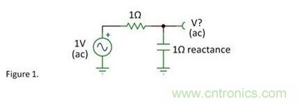 题目很简单,如下所示:一个1V的交流信号,连接着一个1Ω电阻和一个1Ω电抗的电容。在电容两端的交流电压是多少?