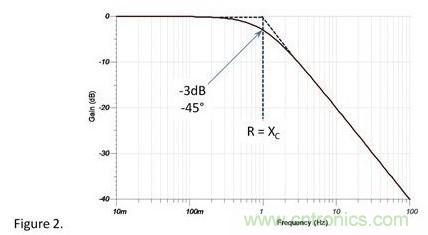 R/C电路产生了极点。阻值和抗值相等时的频率为“拐点”或称截至频率。这点的响应是-3dB(0.707V)的衰减,和45°的相位滞后。如图所示:不需要数学计算,波特图如下: