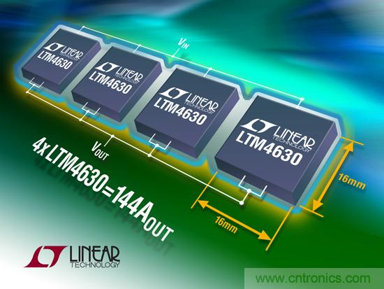 凌力尔特公司推出双输出 18A 或单输出 36A DC/DC 微型模块 (µModule®) 降压型稳压器 LTM4630,当 4 个器件均流时,该器件能提供高达 144A。LTM4630 是一款完整的 DC/DC 稳压器系统,采用 16mm x 16mm x 4.41mm LGA 封装,其中包括了电感器、MOSFET、DC/DC 控制器和补偿电路。该器件采用了技术高超的模拟和封装设计,能实现高效率和低热量封装阻抗。从 12VIN 在 36A 产生 1VOUT 时,效率为 86%,采用 5VIN 时效率为 88%。LTM4630 无需外部散热器就可在高达 60ºC 环境温度 (无空气流动)、65ºC (200LFM) 和 69ºC (400LFM) 情况下,提供 36A。如果使用外部散热器,那么最高工作环境温度可提高大约 10ºC。