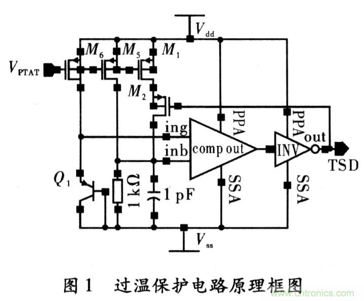 图1为本设计的原理架构,Q1为NWELLCMOS工艺中寄生PNP三极管,其集电极是必须与地点位连接,为了利用寄生PN结导通正向导通电压的负温度特性,把Q1做二极管连接(基集也接到地),这样A点和地之间的电压VA就具有了PN结正向电压的与温度成反比的性质。由于基准电路输出的偏置电压加在M0、M1、M5的栅极上,则其所在支路上都会产生PTAT电流(Proportional to Abso-lute Temperature);在提供偏置的同时,也在电阻R0上产生了与温度成正比的电压VB即B点电压随之增大。当达到某一温度TH(设定的关断温度)后,VH≥VA、比较器Comp输出高电平,经过倒相器INV后,输出TSD为低电平;此信号作用于电路的其它模块后,使整个芯片停止工作,实现热?;すδ堋M?,TSD信号正反馈作用于M2栅上,开启M2,加大了电阻R0上电流,使VB更高。