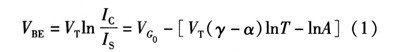 式中VG为带隙电压,γ和α为器件参数,A代表了那些方程推到过程中与温度无关的常量。因为Vt=kt/q,可以得到VBE随温度上升是降低的。其关于温度变化的方程为