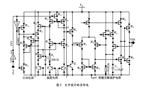 在电路设计上,使用了与温度成正比的电流源(PTAT电流)和具有负温度系数的PNP管(CMOS工艺中寄生)结电压作为两路差动的感温单元。这种差动的传感方式,可以提高电路对温度变化反应的灵敏度,同时,其具有的迟滞功能,可以有效的避免热振荡对芯片的损坏。