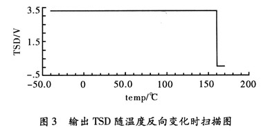 按照以上设计的电路。用Cadence Specture对其进行仿真,器件的模型参数采用0.35μm CMOS工艺。图2为过温保护电路的输出控制信号TSD,随温度上升和下降的曲线。电源电压取3.3 V。从仿真结果可以看出,该电路实现了良好的“温度迟滞”特性。迟滞功能有效的避免了芯片出现热振荡问题。关断温度TH160°和恢复温度TL140°。