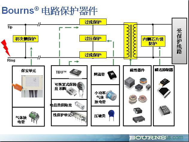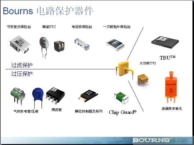 这个是目前我们所有的保护元器件。?;ぴ骷此?,我们主要分为两块,一个是过流的,一个是过压的。过流包括可恢复式保险丝、陶瓷PTC、电信类保险丝、一次断贴片保险丝。过压?;さ陌ㄆ宸诺绻?压敏、闸流管等。另外我们还有大功率TVS、TBU、浪涌保安单元。
