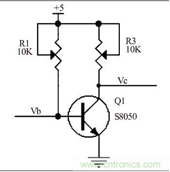 3、当我们调节可调电阻,R1,使R1=2.15K时,通过欧姆定律我们可以计算得到,Ib=(5-0.7)/2.15K=2mA,那我们就可以计算出IC=Hfe*Ib=20mA,假如这个时候我调节R3,使R3=1K欧姆,通过计算我们可以得到Vc=5-(20mA*1K)=-15V,回出现-15V吗,当然也不会,同样因为没有负压,所以Vc的电压会停留在0V,那这个时候我们再来看下Ic到底是多少?