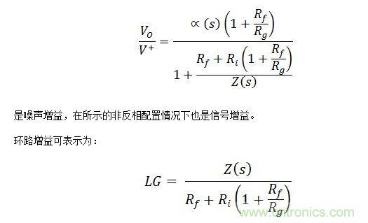 这对于理想的CFB[Ri=0]来说,是一个非常重要的公式,因为它表明了环路增益与反馈电阻的比例关系,因此反馈电阻可作为CFB的主要补偿。事实上,增加反馈电阻及带宽(BW),不仅会降低反馈电阻,同时还可增大带宽。实际上,不可能将反馈电阻降低到特定值以下,否则放大器会发生振荡。