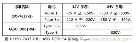 最大重复反向电压是二极管在反向偏压模式中能够承受的最大电压。在反向偏压模式中,流过二极管的漏电流会在二极管结中产生热量并导致热失控。模拟该条件的测试包括美国的ISO-7637-2 pulse 1和3a以及日本的JASO D001-94标准type B和E.Each,这些测试的峰电压如下表所示。