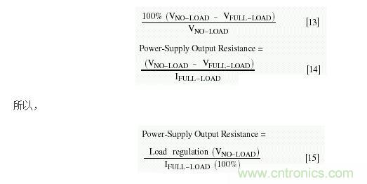 利用[12]式,可计算出RBISTABLE为0.320Ω。方程[9]的图形表明,电源效率随着RS的增加而跌落,在RS = RBISTABLE时跌落达20%。注意:该结论并不具有普遍性,对于每个应用,必须分别进行计算。RS的来源之一,是所有电源无法避免的、有限的输出电阻,它可通过负载调整来确定,后者通常定义为: