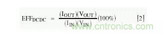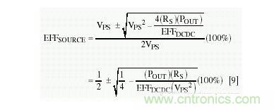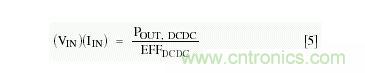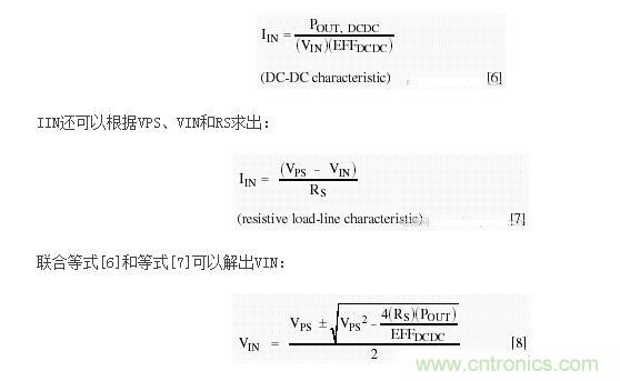 现在,我们有了足够的信息来计算电源自身的耗散功率及其效率。因为电源电压的开路值(VPS)已经给出,我们仅需找出DC-DC转换器的输入电压(VIN)。从等式[5]解出IIN: