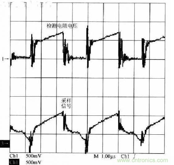 图4给出了UC3842检测电阻的电压波形和采样信号波形。从图4中可以看出,经过改进后的电路,其采样信号的波形紧紧跟随检测电阻的电压波形,没有出现非常大的尖峰电压。因此,该电路能有效避免因变压器漏感等异常干扰引起的电源误操作的问题,也能有效避免因电源占空比过大而引起的系统不稳定的问题。