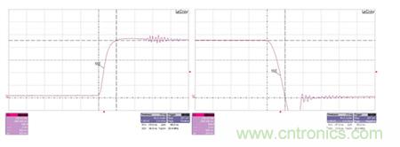 具有50ohm输出的任意波形发生器足以驱动MOSFET栅极。使用“脉冲”波形并保持很低的占空比,以限制开关和检测电阻器的功耗 —— 频率为1kHz时10%是合理的。调谐栅极电压以便在其线性区域中运行场效应晶体管(FET),目的是设置电流。使用具有全带宽的差分探头或无源探头来对跨检测电阻器的电压进行检测。计算电流用检测电阻除测量的电压,计算转换速率用时间变化除电流变化(ΔI/Δt)。通过增加(或减少)波形发生器的上升和下降时间来调整ΔI/Δt。图2展示了瞬态负载经校准的电压(电流)波形。