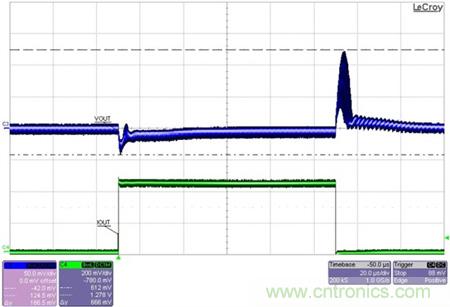 图3展示了对0.9V输出(被15A的负载阶跃以300A/us的速率扰动)的瞬态响应。
