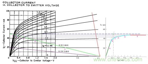 图中假定电源电压为4V,绿色的斜线是负载电阻为80欧姆的负载线,V/R=50MA,图中标出了Ib分别等于0.1、0.2、0.3、0.4、0.6、1.0mA的工作点A、B、C、D、E、F。据此在右侧作出了Ic与Ib的关系曲线。根据这个曲线,就比较清楚地看出“饱和”的含义了。曲线的绿色段是线性放大区,Ic随Ib的增大几乎成线性地快速上升,可以看出β值约为200。兰色段开始变弯曲,斜率逐渐变小。红色段就几乎变成水平了,这就是“饱和”。实际上,饱和是一个渐变的过程,兰色段也可以认为是初始进入饱和的区段。在实际工作中,常用Ib*β=V/R作为判断临界饱和的条件。在图中就是假想绿色段继续向上延伸,与Ic=50MA的水平线相交,交点对应的Ib值就是临界饱和的Ib值。图中可见该值约为0.25mA。