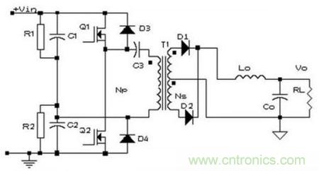电容器C1和C2与开关管Q1、Q2组成桥,桥的对角线接变压器T1的原边绕组,故称半桥变换器。如果此时C1=C2,那么当某一开关管导通时,绕组上的电压只有电源电压的一半。