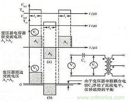 如果要这种不平衡的波形驱动变压器,将会发生偏磁现象,致使铁心饱和并产生过大的晶体管集电极电流,从而降低了变换器的效率,使晶体管失控,甚至烧毁。
