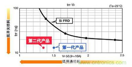 图1.SiC肖特基二极管与硅材质FRD特性比较(650V/10A级)