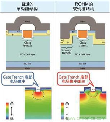 沟槽结构因在SiC-MOSFET中采用,可有效降低导通电阻而备受关注。但为了确保元器件的长期可靠性,需要设计能够缓和Gate Trench部分(通过有无施加电压来控制MOSFET元件的开关ON/OFF的部位)产生的电场的结构。因为当仅在Gate Trench部位采用沟槽结构时,Gate Trench结构底部电场集中,很难确保元器件的可靠性。ROHM通过采用独创的结构,缓和了Gate Trench结构底部的电场集中现象,从而成功实现了采用沟槽结构的SiC-MOSFET的量产(图6)。