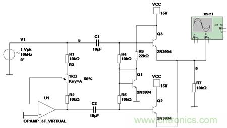 从仿真结果可以看出输出的波形比输入波形稍往上有个偏移。这是由于 Q1 将Q2 和 Q3 的基极电位抬高使得 Q2和Q3处于微微开启状态,也就是当输入信号为0时,输出也是稍有些电压的。不过这个偏移很小,只有几十mV。对大多数的应用来说没有太大的影响。如果对此很在意,可以适当的加大R6的阻值,R6增大,Q1的基极电流降级, 发射结压降降低,Q2、Q3的基极静态工作点同样也会降低。