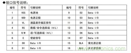 我们首先来看1602的引脚定义,1602的引脚是很整齐的SIP单列直插封装,所以器件手册只给出了引脚的功能数据表: