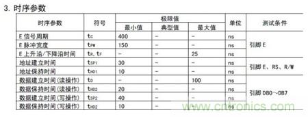 也许你还注意到了上面有许多关于时间的标注,这也是个十分重要的信息,这些时间的标注表明了某些状态所要维持的最短或最长时间。因为器件的工作速度也是有限的,一般都跟不上主控芯片的速度,所以它们直接之间要有时序配合?;八迪衷诟髦执砥鞯闹髌狄彩欠杩裨龀?,日后搞不好出现个双核单片机也不一定就是梦话。下面是时序参数表: