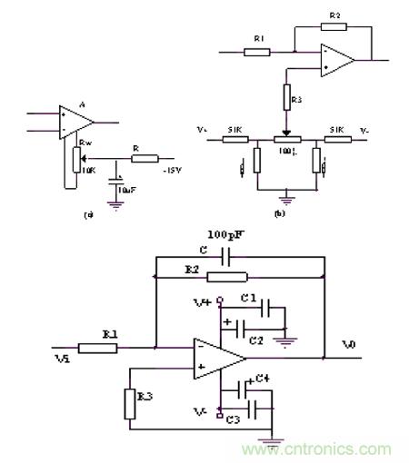 另外,防止通过电源内阻造成低频振荡或高频振荡的措施是在集成运放的正、负供电电源的输入端对地一定要分别加入一电解电容(10mF)和一高频滤波电容(0.01mF~0.1mF)。如图3.2.3所示。