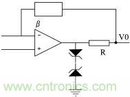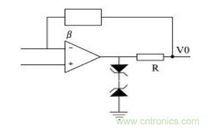 (3)输出保护。当集成运放过载或输出端短路时,若没有保护电路,该运放就会损坏。但有些集成运放内部设置了限流?;せ蚨搪繁;?使用这些器件就不需再加输出保护。对于内部没有限流或短路?;さ募稍朔?可以采用下图所示的输出?;さ缏贰T谙峦嫉缏分?当输出?;な?由电阻R起限流保护作用。