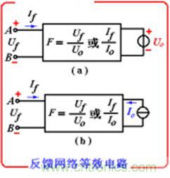 绘反馈网络的输入回路时,对电压反馈,其输入用恒压源Uo代替基本放大电路;对电流反馈,用恒流源Io代替基本放大电路,如下图所示。
