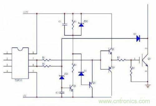 所以IGBT的短路?;ひ话闶桥浜瞎乇;さ?,下面是一个TLP250增加慢降栅压的驱动和短路保护的应用电路图: