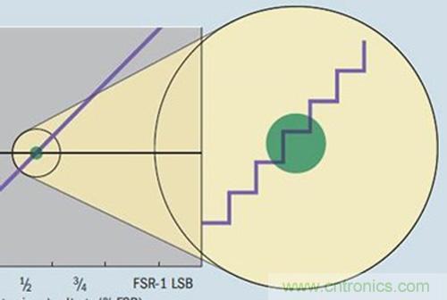 总之,没有能为A/D转换器计算TUE最大值的确定公式,因为该误差取决于A/D转换器工作时的输入范围。如果系统不需要采用A/D转换器的整个输入范围,那么工程师可通过使该器件远离其传递函数的端点运行来最大限度地减小TUE。