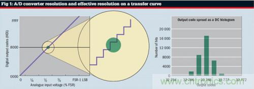 A/D转换器的分辨率被定义为输入信号值的最小变化,可通过一次计数改变数字输出值。就理想的A/D转换器而言,传递函数呈阶梯状,且每个步阶宽度等于分辨率。但使用较高分辨率(16位或16位以上)的系统时,传递函数的响应和理想的响应之间将存在较大的偏差。这是因为由A/D转换器及驱动器电路产生的噪声可降低该转换器的分辨率。