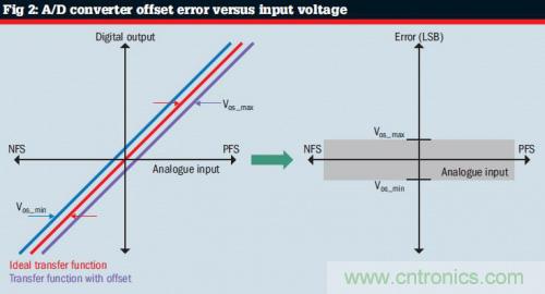 偏移误差(VOS)。该误差是A/D转换器实际传递曲线和理想传递曲线之间的恒定差异(见图2)。它是测定的数字输出,通过把A/D转换器输入端短接到接地(GND)获得。