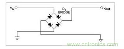 2,另外还可以用二极管桥对输入做整流,这样电路就永远有正确的极性(图2)。这些方案的缺点是,二极管上的压降会消耗能量。输入电流为2A时,图1中的电路功耗为1.4W,图2中电路的功耗为2.8W。