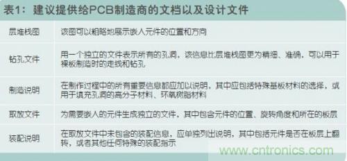 在设计嵌入元件时,为了确保成功无误,重要的一点是与PCB制造商充分的沟通,表1中罗列出了建议提供给PCB制造商的文档以及设计文件。