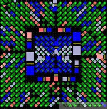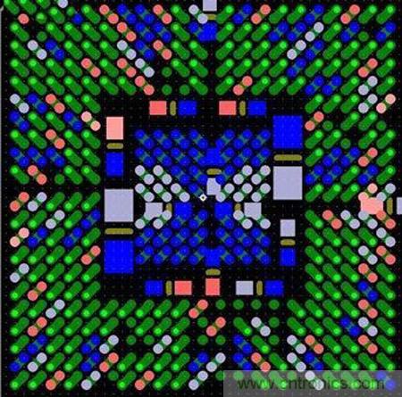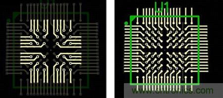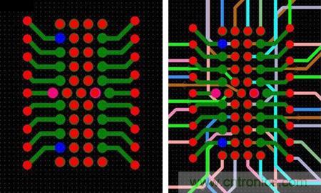 图6:这种扇出方法避免了使用高端技术,而且不会影响信号完整性。BGA引脚分成内部引脚和外部引脚两部分。