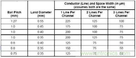一旦完成了Dog bone型扇出,并且确定了特定的过孔焊盘尺寸,第二步就是定义从BGA进入电路板内层的走线宽度。确认走线宽度时要考虑许多因素。表1显示了走线宽度。走线之间要求的最小空间限定了BGA迂回布线空间。重要的是要知道,减小走线之间的空间将增加电路板制造成本。