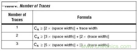 两个过孔之间的区域被称为走线通道。相邻过孔焊盘之间的通道面积是信号布线必须经过的最小面积。表1用来计算可以经过这个区域布线的走线数量。