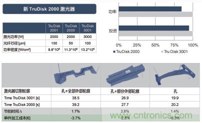 为了降低单件加工成本,我们也开发了采用2kw激光器TruDisk 2000的激光切割工艺。虽TruDisk 2000的激光功率只有TruDisk 3001的2/3,但其功率密度却非常接近,因为它的光纤更细,芯径只有50μm。因此,对于一些较薄零件的切割,TruDisk 2000的切割时间只比TruDisk 3001多了2%,而单件加工成本却最多可以降低6%(图7),其投资成本和能耗更低。