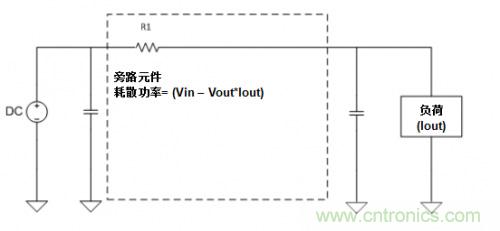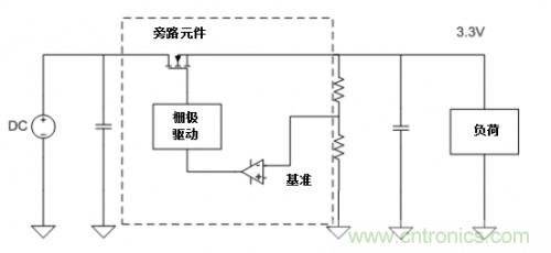 图1. 线性稳压器框图。注意,旁路元件将在其自身和负荷之间形成一个分压器,起到耗散功率的作用。