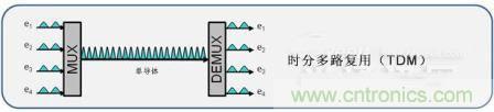 时分复用是一种通过使用越来越小的时间增量来传输更多的数据的方式,并且将较低数据率的信号复用进较高速度的复合信号中。通过时分复用,较低速度的电信号交错在时间中,并在较快的复合光路上传输。因此,所得的较高数据速率将是单个输入速率的数倍。