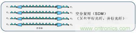 空分复用,通常被称为并行光纤,是一种通过在复合链路中增加一条或多条光纤来增加一个或多个通道的方式。在这种情况下,一个通道实际上就是另一股光纤。这是上述时分复用通道的一个替代方案,在时分复用中,信号以按时间合并在同一条光纤上。行业中有很多应用这种技术的例子。例如,40G SR4通过使用四通道或光纤,在多模光纤上提供40Gbps的速率。也就是在每个方向上有四个通道。这也正是“SR4”中4的含义,4个通道,每个10Gbps。