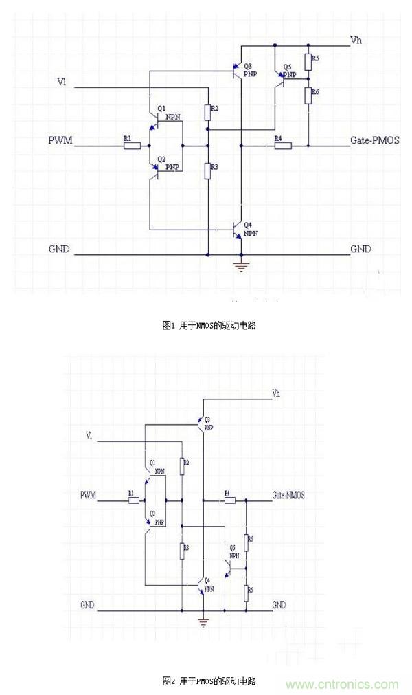这里我只针对NMOS驱动电路做一个简单分析:Vl和Vh分别是低端和高端的电源,两个电压可以是相同的,但是Vl不应该超过Vh。Q1和Q2组成了一个反置的图腾柱,用来实现隔离,同时确保两只驱动管Q3和Q4不会同时导通。 R2和R3提供了PWM电压基准,通过改变这个基准,可以让电路工作在PWM信号波形比较陡直的位置。 Q3和Q4用来提供驱动电流,由于导通的时候,Q3和Q4相对Vh和GND最低都只有一个Vce的压降,这个压降通 常只有0.3V左右,大大低于0.7V的Vce。 R5和R6是反馈电阻,用于对gate电压进行采样,采样后的电压通过Q5对Q1和Q2的基极产生一个强烈的负反馈, 从而把gate电压限制在一个有限的数值。这个数值可以通过R5和R6来调节。